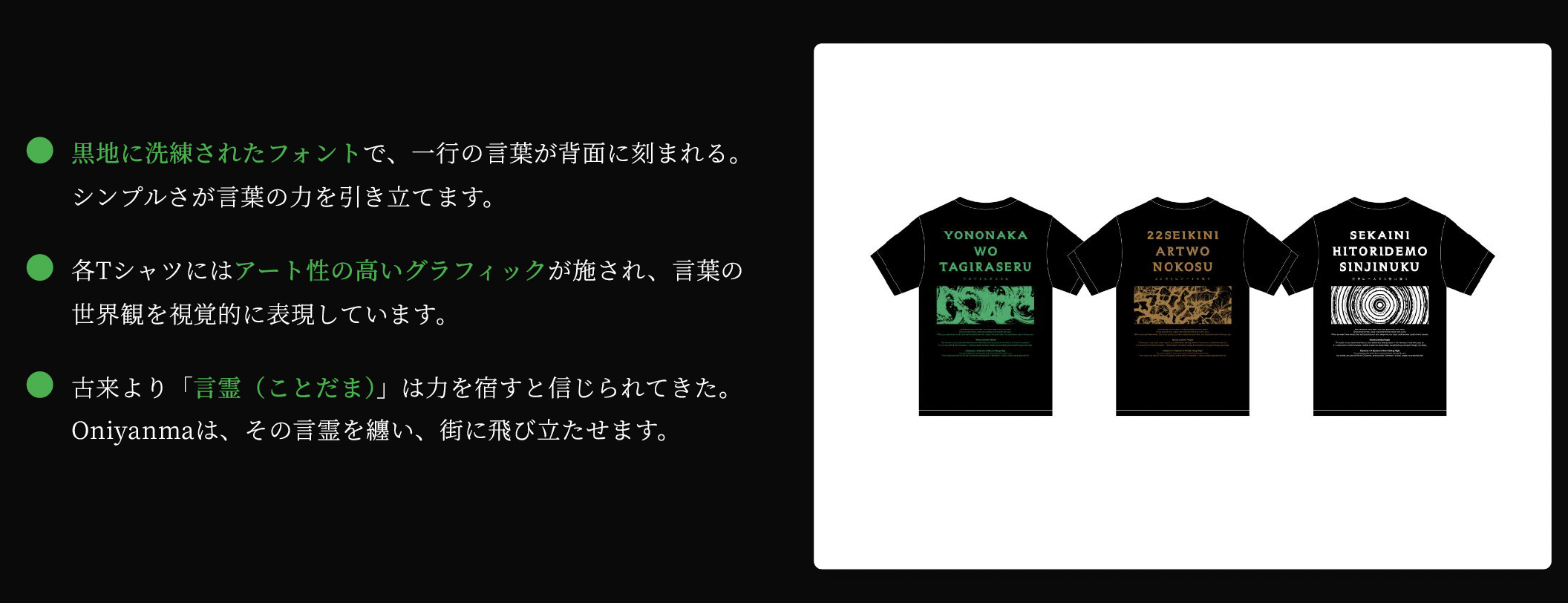 - 言霊の持つ力:文字を読めなくとも、意味を知れば誰かに伝えたくなる。その衝動が、言葉を世界へ旅立たせます。また自国の言語では伝えにくい言葉ですら、日本語とアートなら伝えられる。まさに「言葉」と「Tシャツ」を合わせた新たな自己表現である。