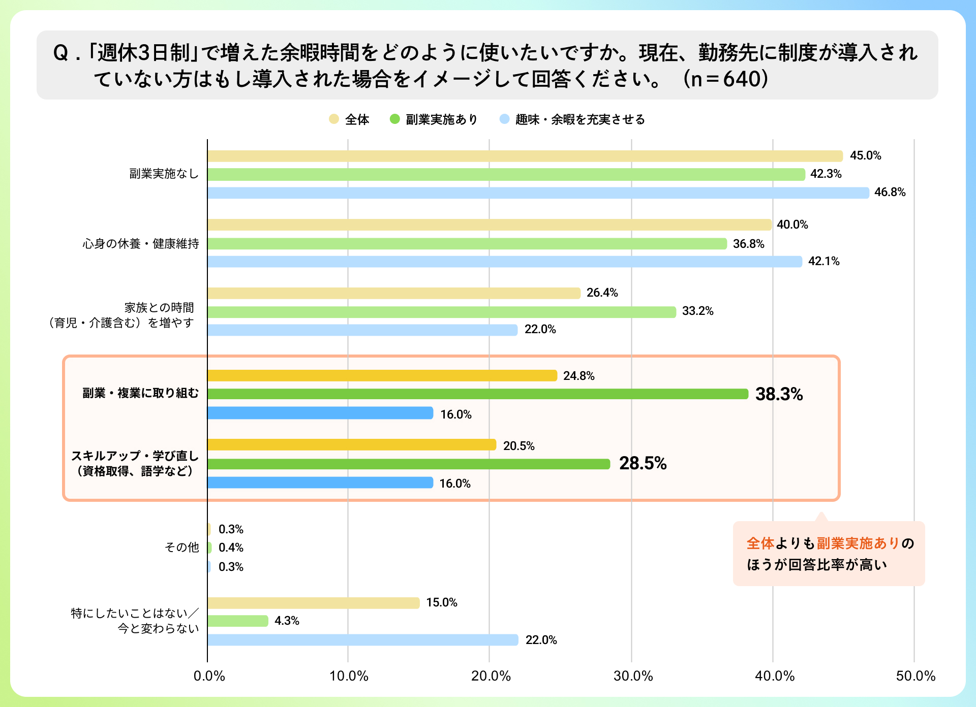 「週休3日制」で増えた時間で、副業やリスキリングに取り組む姿勢も