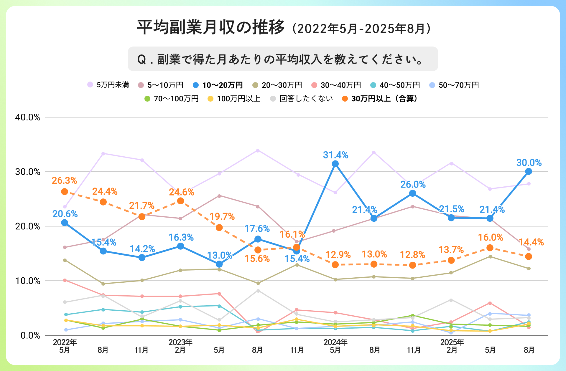 また、過去の調査結果と比較すると、平均副業月収が「10万円以上20万円未満」と回答した方の割合は、2024年5月調査の31.4%に次ぐ2番目に高い割合となりました。