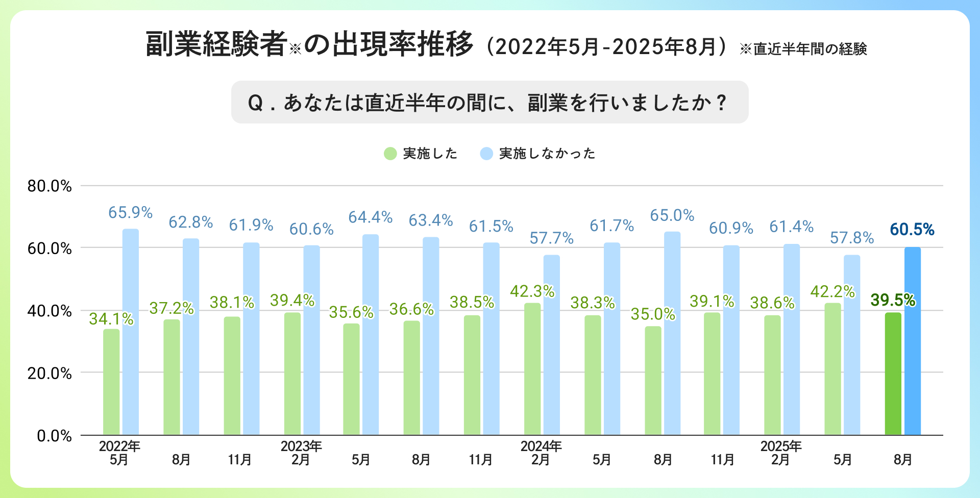 副業経験者の推移を見ると、直近半年間で副業を「実施した」と回答した人の割合は前回調査(2025年5月)の42.2%から39.5%へ2.7ポイント減少し、今後副業を「実施するつもりだ」と回答した人の割合も、前回調査の51.8%から48.0%となり、3.8ポイント減少していました。副業職種別に副業の実施率の推移をみると、特に営業職での減少が顕著で、前回調査の15.1%から9.1%へ6ポイント低下していました。