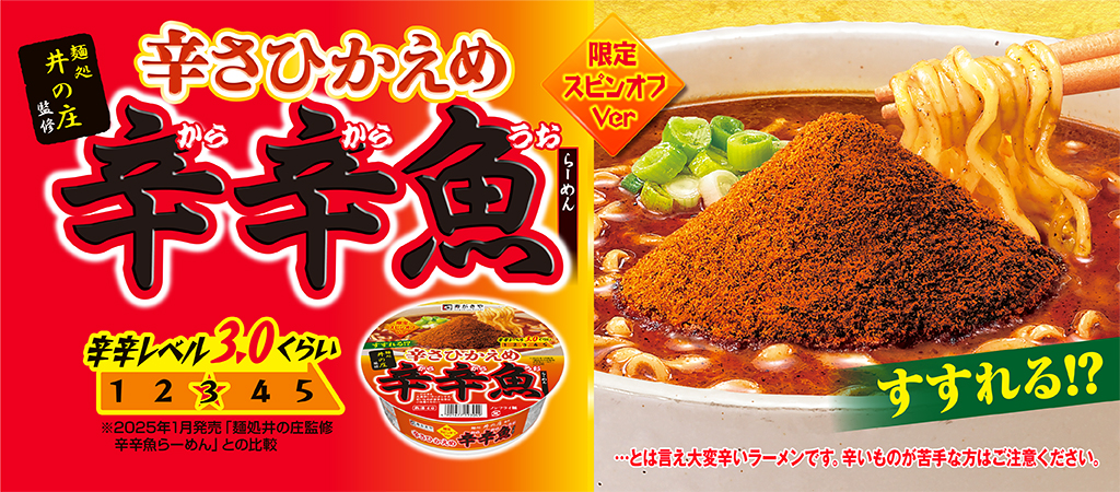 昨年発売しご好評をいただいた『麺処井の庄』監修の「辛辛魚らーめん」のスピンオフバージョン「辛さひかえめ」を今年も期間限定で発売いたします。