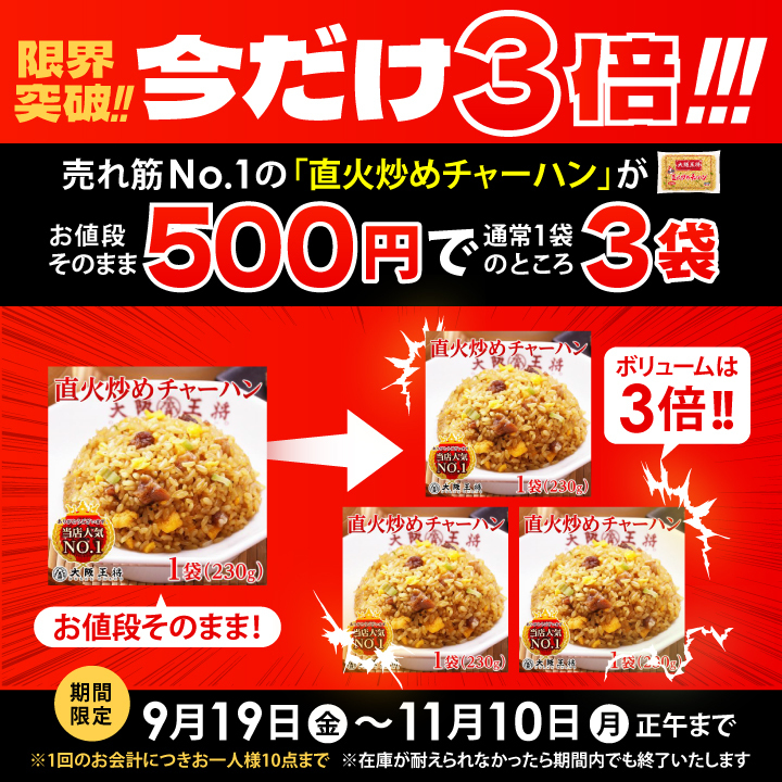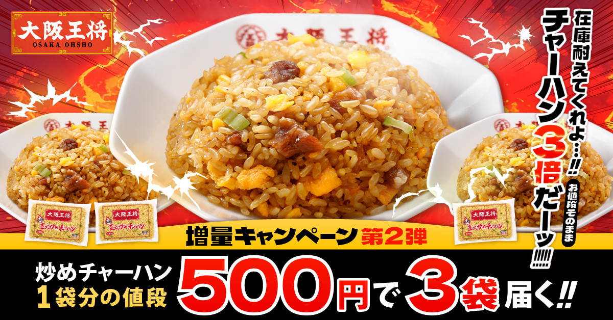 大阪王将の冷凍炒飯が500円で3袋!? 3倍増量キャンペーンスタート!