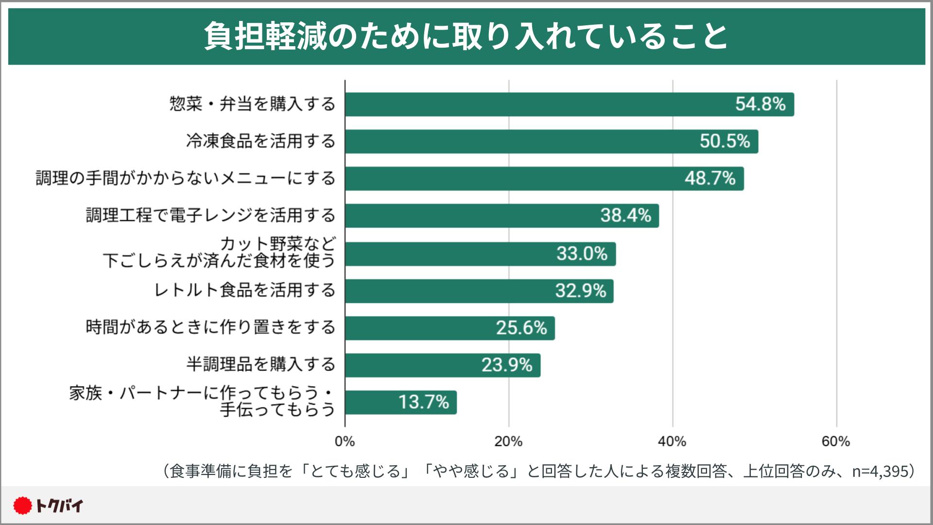 食事準備の負担を軽減するために取り入れていることとして、最も多かったのは「惣菜・弁当を購入する」(54.8%)、続いて「冷凍食品を活用する」(50.5%)が挙がりました。