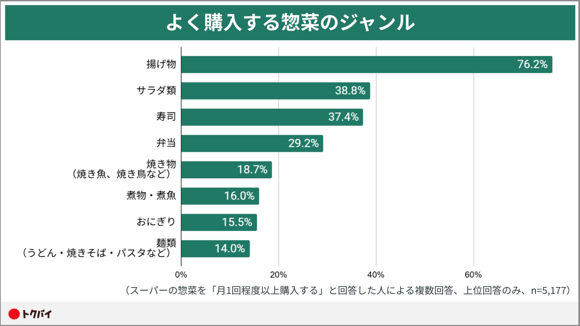 よく購入する惣菜のジャンルで最も多いのは「揚げ物」(76.2%)。先述の購入動機で「手間や食材費を考えると作るより買った方がコスパがいい」が上位に挙がったように、自宅で揚げる手間を考えると市販品を購入したほうがいいと考える人が多いと推察されます。2位には「サラダ類」(38.8%)、3位に「寿司」(37.4%)が続きました。
