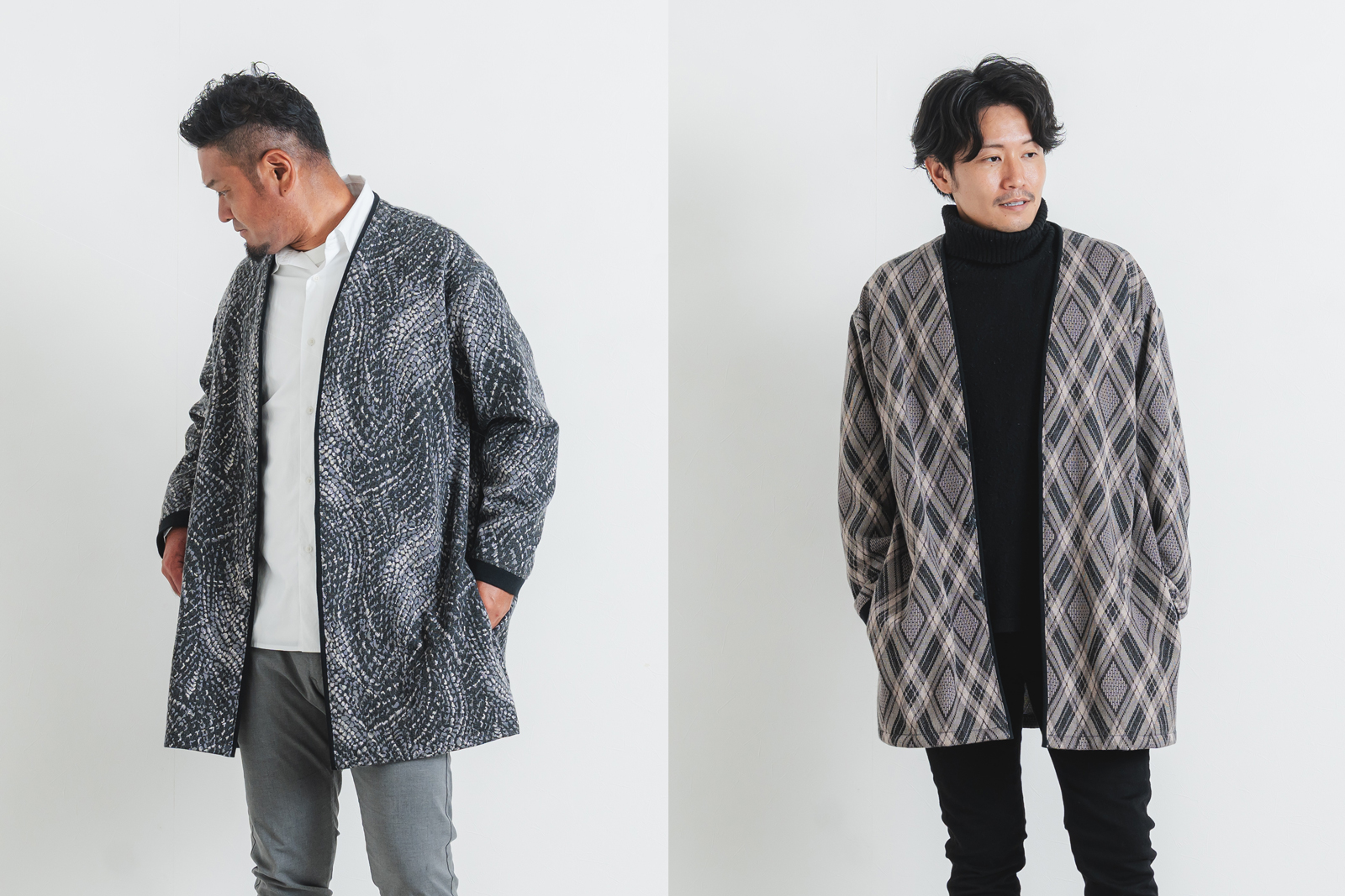 本製品は、歴史ある地域繊維 尾州ウールをアップデートした、オリジナルデザイン生地の羽織カーディガンです。