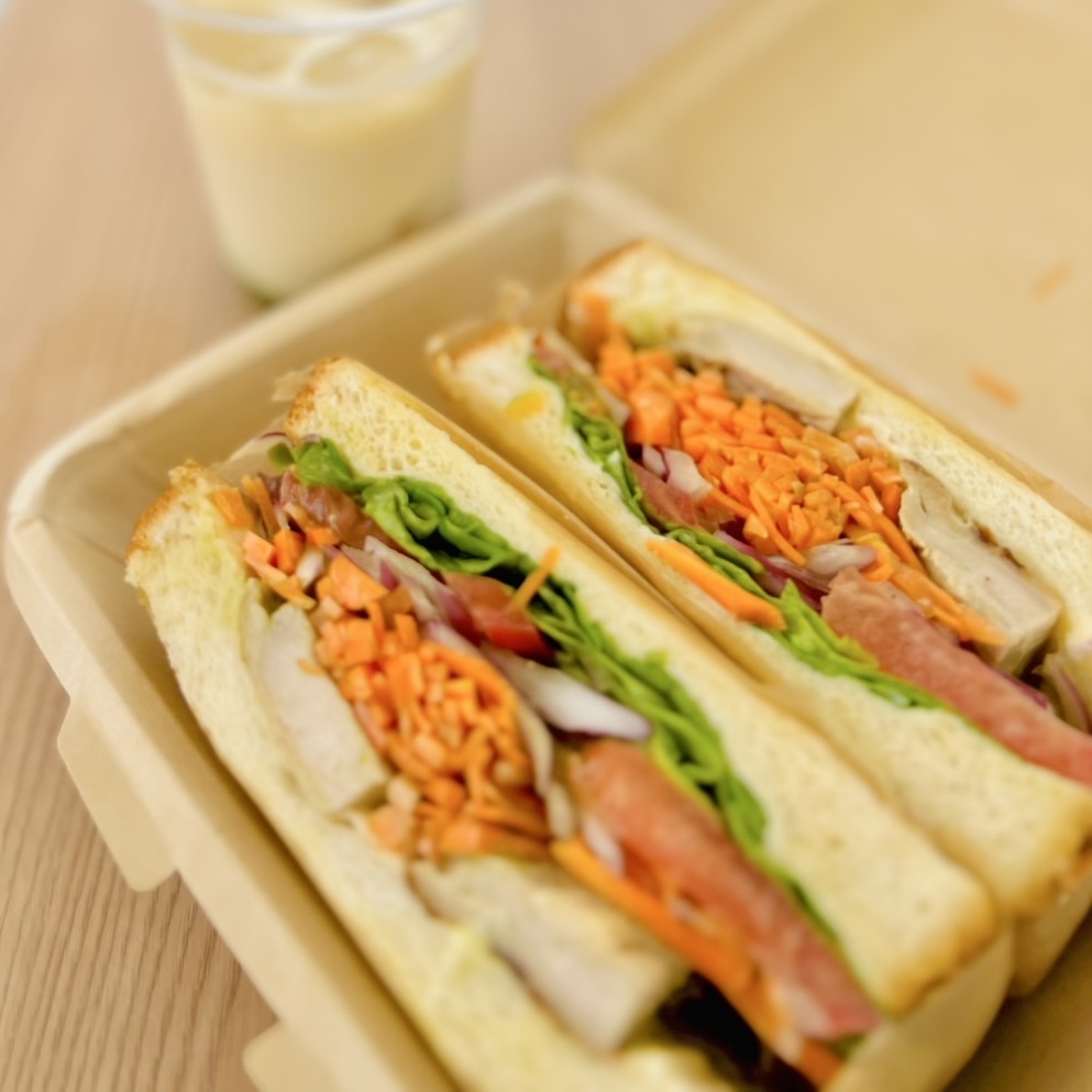 日本の発酵文化を代表する「麹」を漬け込んだチキンと、みずみずしい野菜をたっぷり挟み込んだボリューム満点のサンドイッチ。 青汁を取り入れた手作りのバジルソースで爽やかさを加え、食物繊維も摂ることができます。 サロンテーマの1つ「発酵」を体感できる一品です。