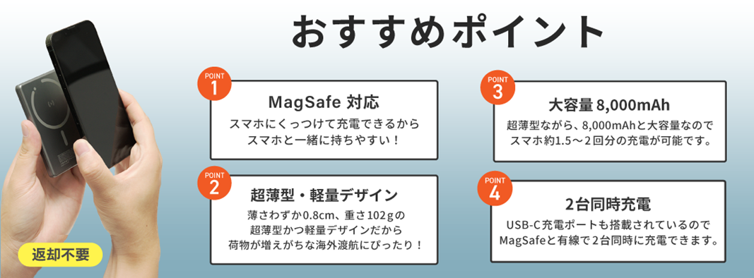 「人と人をつなぐ。」「世界をつなぐ。」をテーマに、海外用Wi-Fiルーターレンタルサービス「グローバルWiFi®」をはじめとする情報通信サービスやツーリズム事業を展開する株式会社ビジョン(本社:東京都新宿区 代表取締役社長 COO:大田健司 以下、当社)は、このたび、「グローバルWiFi®」から【MagSafe対応】超薄型モバイルバッテリーの提供を開始しました。