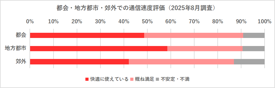 都会・地方都市・郊外いずれでも9割前後が満足と回答。郊外では「概ね満足」が中心ですが、大きな不満は見られませんでした。