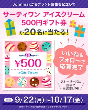 抽選で【20名様】に「サーティワン アイスクリーム 500円ギフト券」プレゼント!