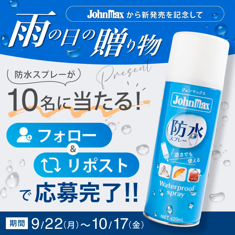 【簡単応募&プレゼント企画】日常の不快から“守る・防ぐ” 新商品「Johnmax 防水スプレー」今秋の新発売を記念してSNSプレゼントキャンペーンを開催