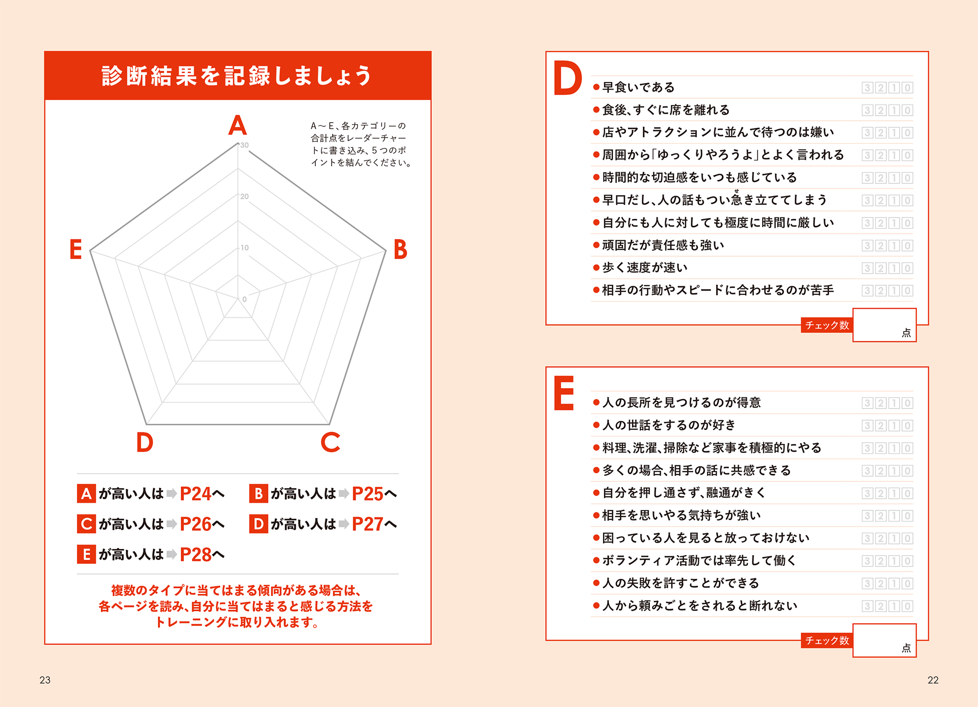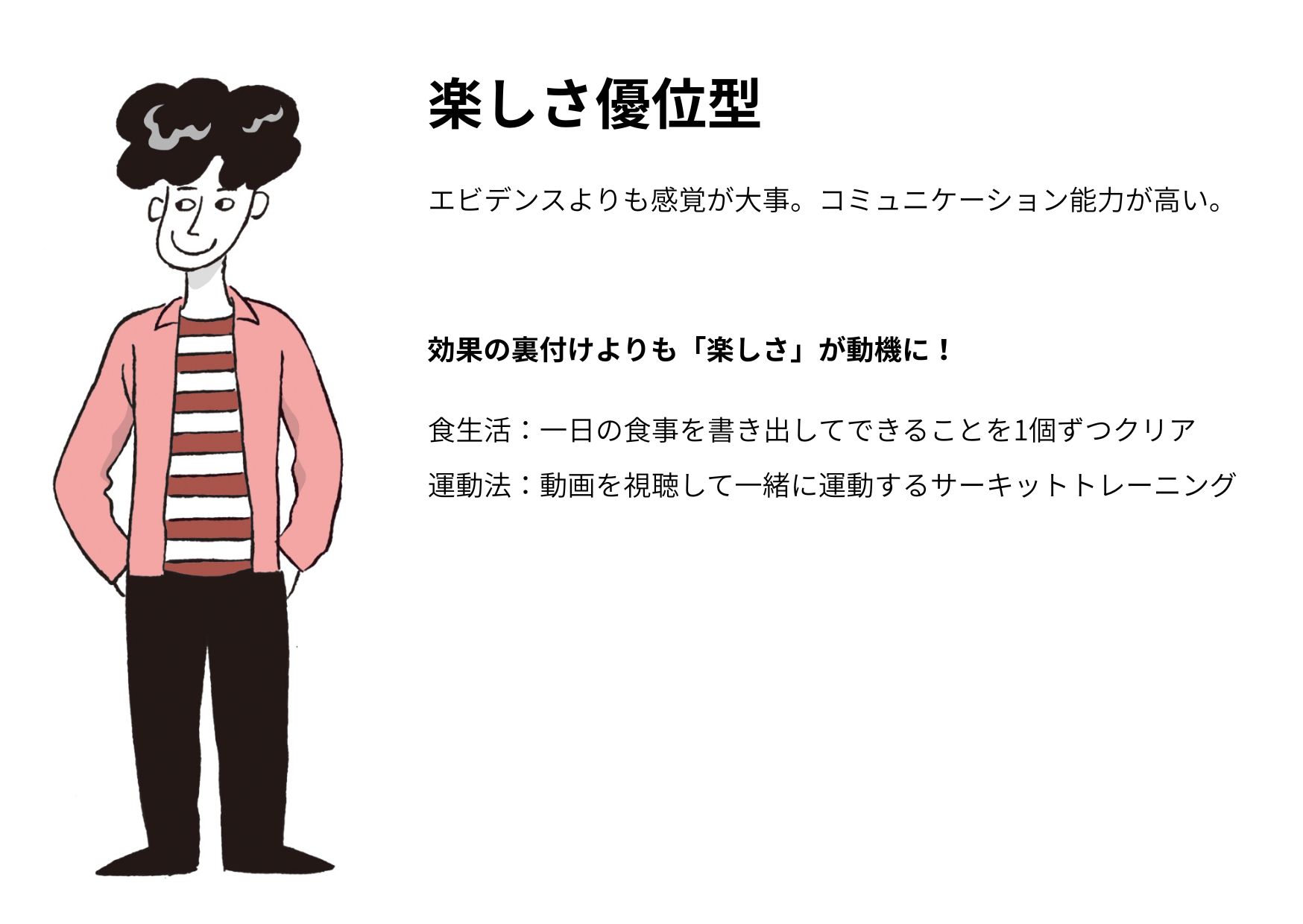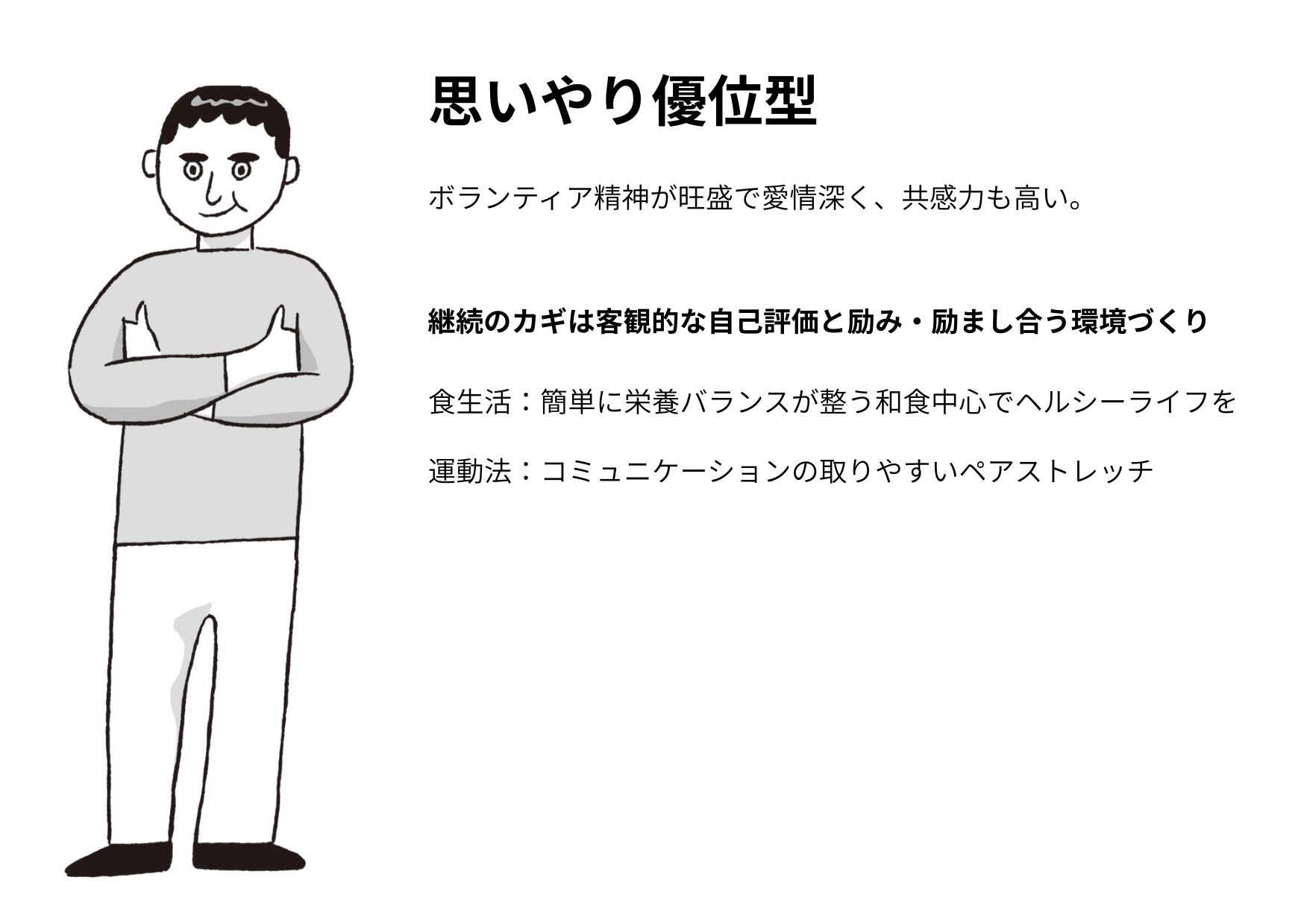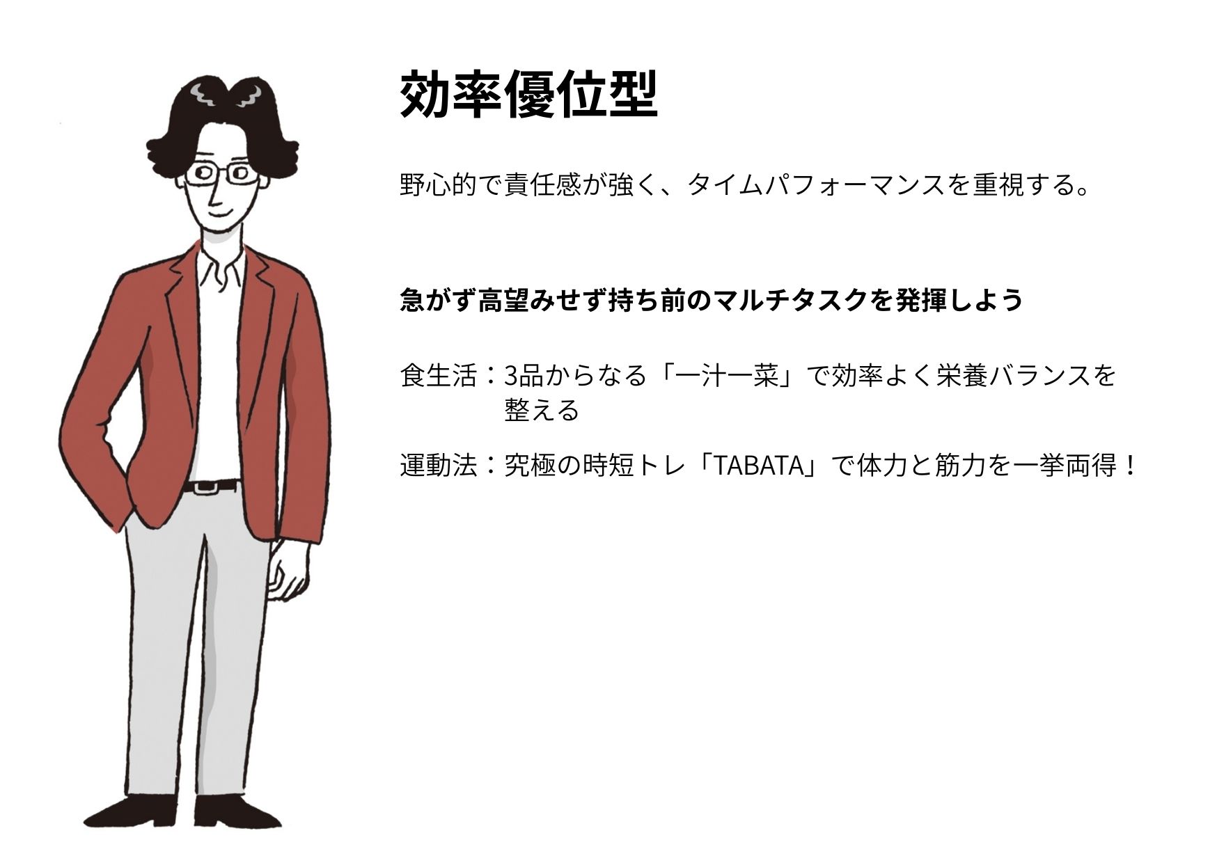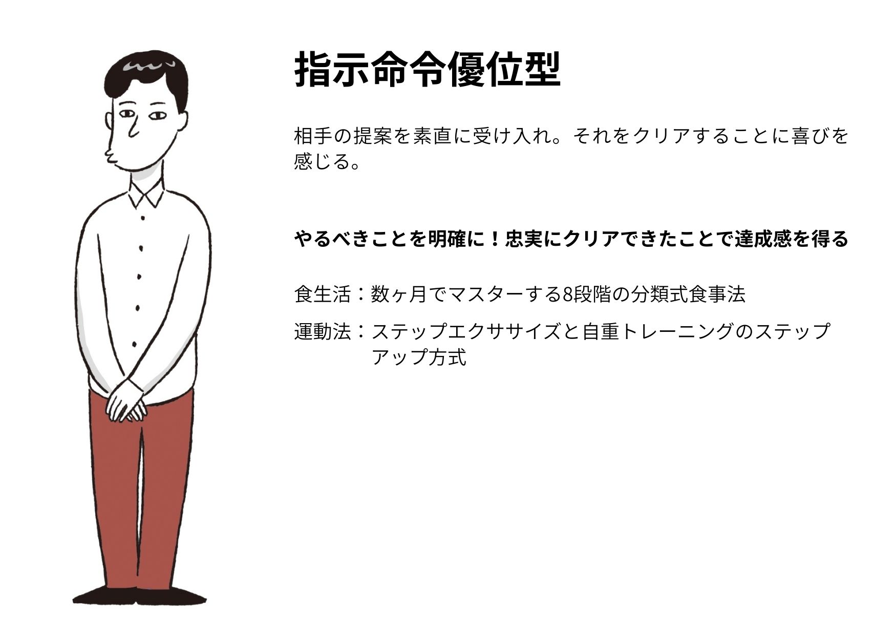 上の「パーソナリティトレーニング診断」で得られる傾向タイプ別に、食生活と運動法を紹介します。