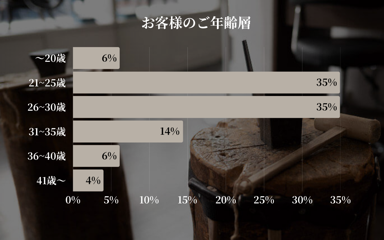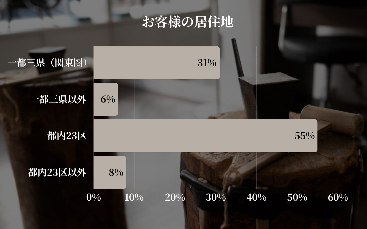 ご来店されたお客様の居住地を分析すると、最も多かったのは「都内23区」で全体の55%を占めており、地元・代官山エリアからの高い関心がうかがえます。一方で、「一都三県(関東圏)」からも31%と広域からのご来店があり、首都圏全体にブランドの魅力が広がっていることがわかります。また「一都三県以外」の遠方からのお客様も一定数おり、特別な体験として選ばれていることがうかがえます。
