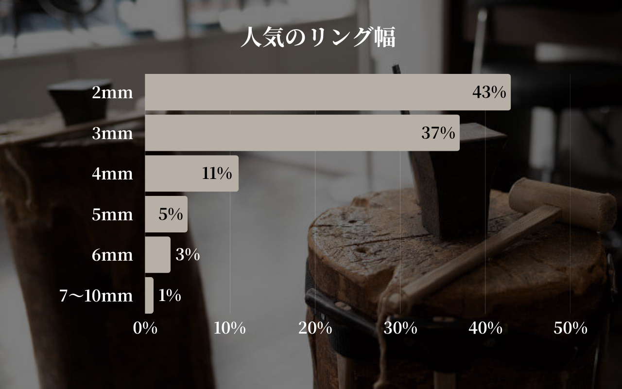 全体の8割を超える方が「2mm」または「3mm」を選ばれており、繊細で指馴染みの良いデザインが主流となっています。主張しすぎず、日常に自然と溶け込むミニマルな美しさが、Z世代や感度の高いカップルに選ばれている理由のひとつです。手元をさりげなく彩る上品なボリューム感が、ペアリングにも結婚指輪にも支持されています。