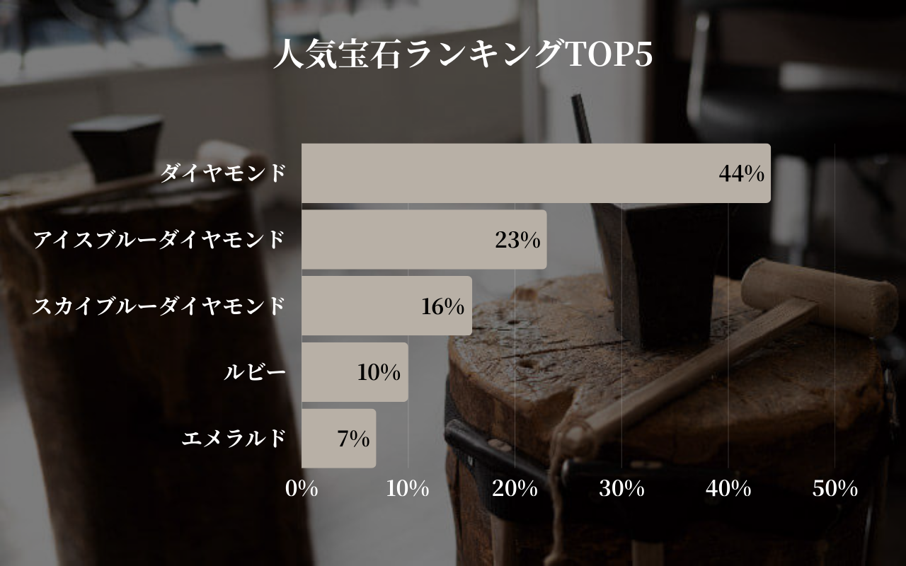 選ばれる宝石の第1位は「ダイヤモンド(44%)」で、変わらぬ人気の高さが際立ちます。2位・3位には「アイスブルーダイヤモンド(23%)」や「スカイブルーダイヤモンド(16%)」など、透明感ある色付きダイヤがランクインし、定番に加えて“自分らしさ”や“推し色”を反映するニーズの高まりが見られます。ジュエリーにもパーソナルなこだわりを込める、Z世代を中心とした選択傾向が浮き彫りとなりました。