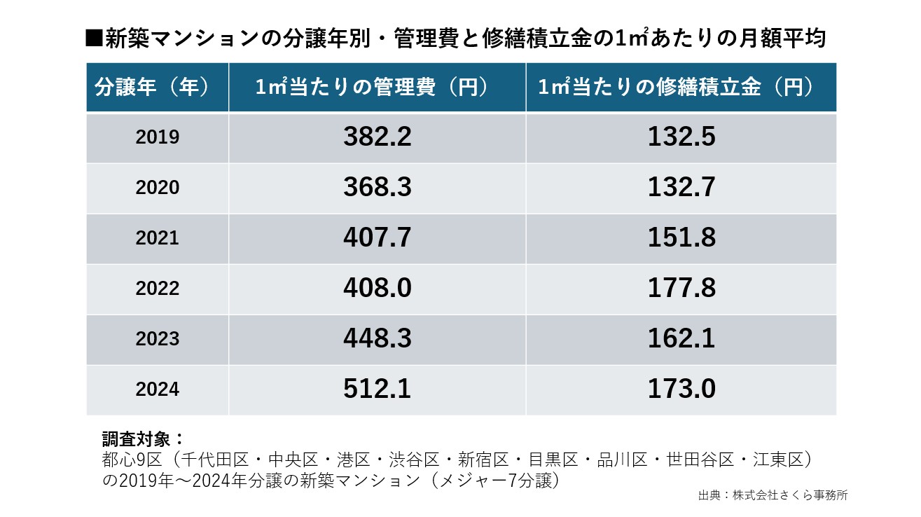 - 当社集計データによると、2024年に分譲された新築マンションの管理費(1㎡あたり)は平均512.1円と、5年前と比べて約34%増加