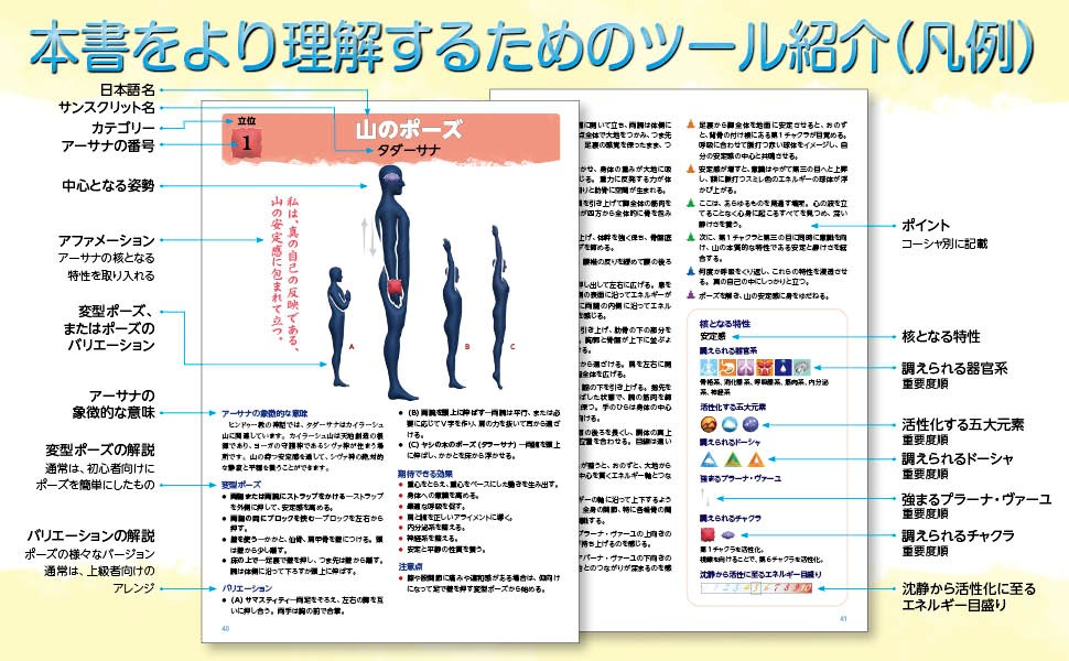 個人的なヨーガの練習をサポートするだけでなく、ヨーガを教える人が、ヨーガのポーズを明確で簡潔な言葉で伝え指導できるように考案されました。さらに、多次元的にアーサナを教えるために、存在としてのあらゆる階層、つまり身体レベル、エネルギーレベル、心理情緒レベル、直感レベル、精神レベルに対応したインストラクションを取り入れた、経験上、唯一無二のヨーガ本となっています。