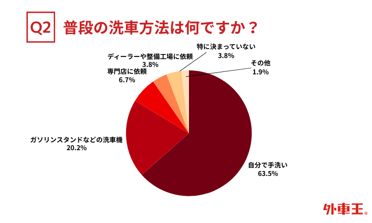 洗車方法については、「自分で手洗い」が63.5%と圧倒的な多数を占めています。この回答からは、愛車を丁寧に、隅々まで洗いたいというオーナーの強いこだわりが感じられます。一方で、「ガソリンスタンドなどの洗車機」を利用する人も20.2%おり、手軽さや時短を求める層も一定数いることがわかります。