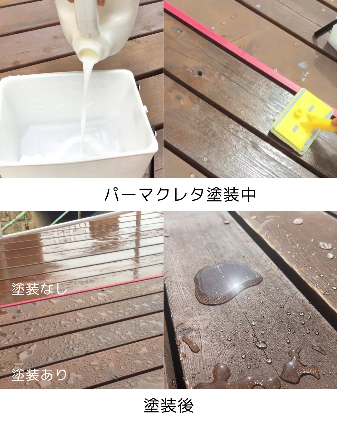 【ウッドデッキの腐食や、コンクリートの劣化を防ぐ!】 コンクリートの劣化やウッドデッキの腐れを防ぐ! アメリカ製の「環境に優しく」「安全な水性の撥水剤」パーマクレタ
