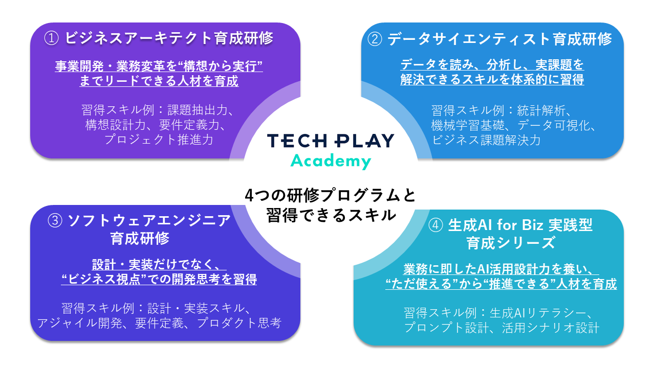『TECH PLAY Academy』では、DX・AI人材育成の核となる4つの研修プログラムを体系的に展開しています。