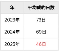 - 2025年には平均成約日数が46日となり、わずか3年間で27日短縮