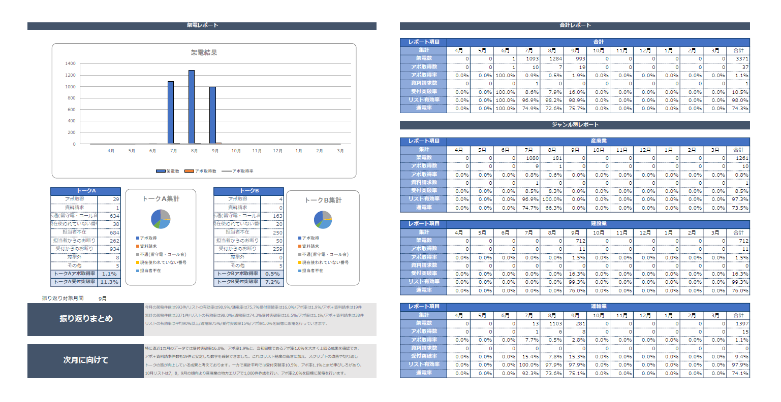 架電件数・通電率・リスト有効率に加え、受付突破率、アポ率、資料請求数を自動集計。
