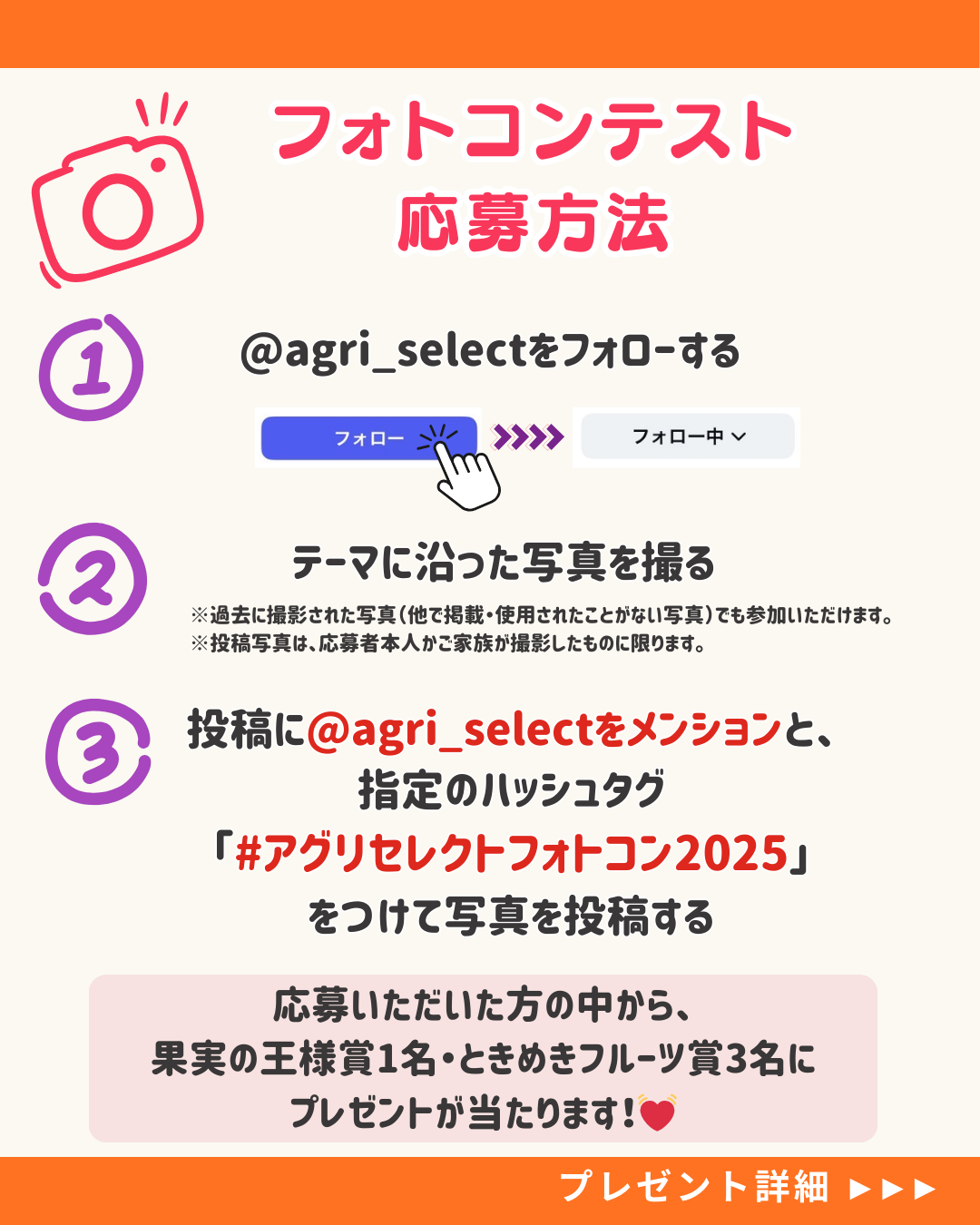 - 投稿に@agri_selectをメンション、ハッシュタグ「#アグリセレクトフォトコン2025」をつけて写真を投稿