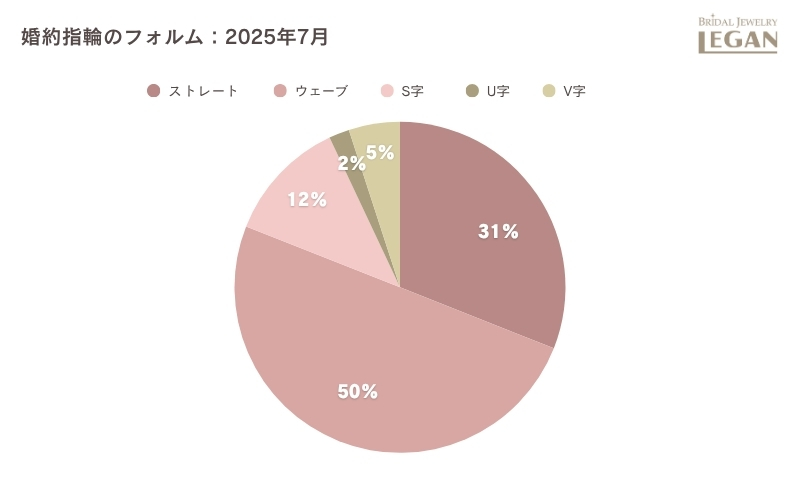 婚約指輪のフォルムは、ウェーブが一番人気が高く50%。ストレートのフォルムが31%でした。S字をご選択の方は12%、V字をご選択の方は5%、U字をご選択の方は2%いらっしゃいました。