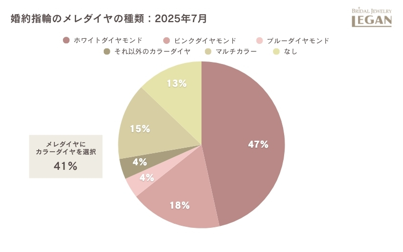 婚約指輪のメレダイヤの種類は、ホワイトダイヤが47%、ピンクダイヤが18%、マルチカラーを15%の方がご選択でした。全体の41%の方が、カラーダイヤをメレダイヤに選択されています。