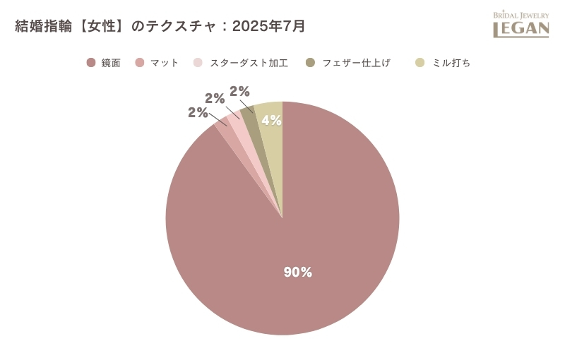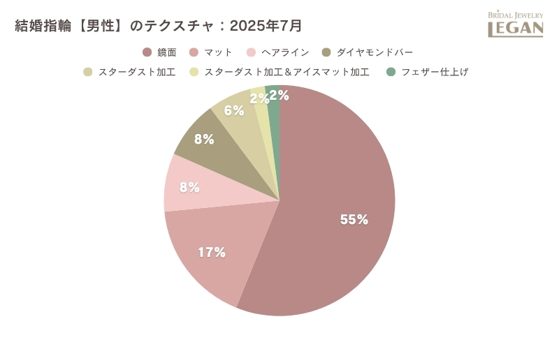 女性の結婚指輪のテクスチャは、婚約指輪同様に鏡面仕上げを選ばれる方が90%と圧倒的です。一方で、男性の結婚指輪のテクスチャは鏡面仕上げが55%に留まり、マット加工やヘアライン加工、ダイヤモンドバー加工などのテクスチャを楽しまれる方も多くいます。