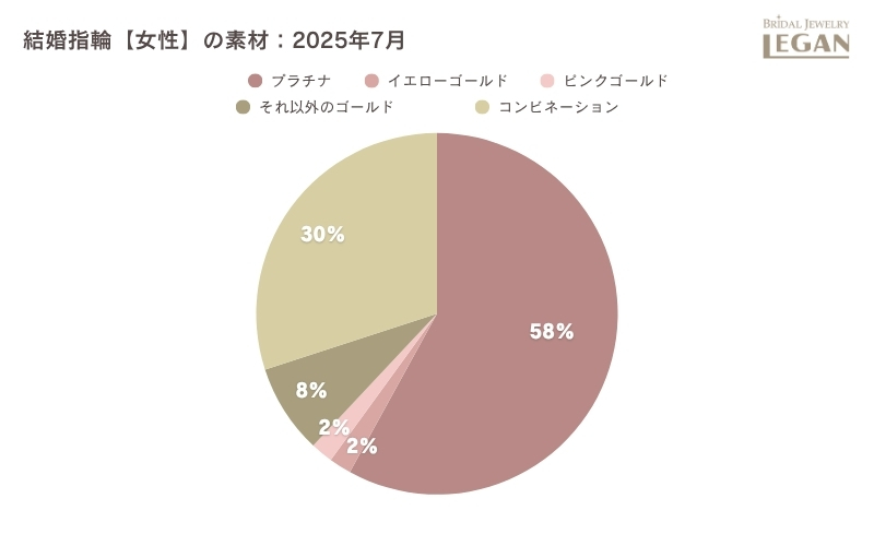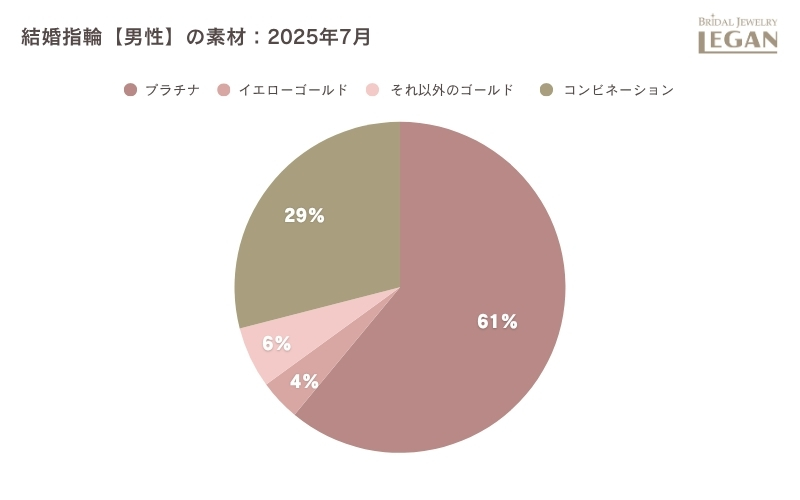 女性の結婚指輪の素材は、58%がプラチナと圧倒的に人気です。次いで、30%の方が様々な素材で組み合わせたコンビネーションを選択されています。男性の結婚指輪の素材は、プラチナが61%ですが、コンビネーションも29%と人気です。