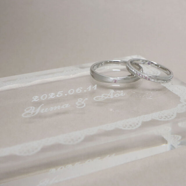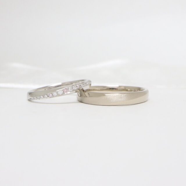 実物は写真以上に可愛く、こちらで購入したい!と即決しました。他のお店よりもアレンジの幅が広く、かなり長時間悩みましたがたくさん相談に乗ってくださり、ピンクダイヤモンドを入れた本当に「自分達だけ」のアレンジリングを作ることができました。