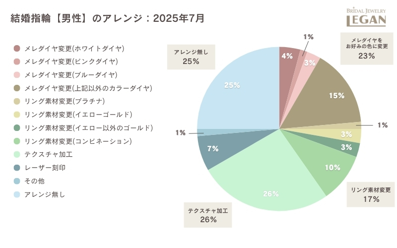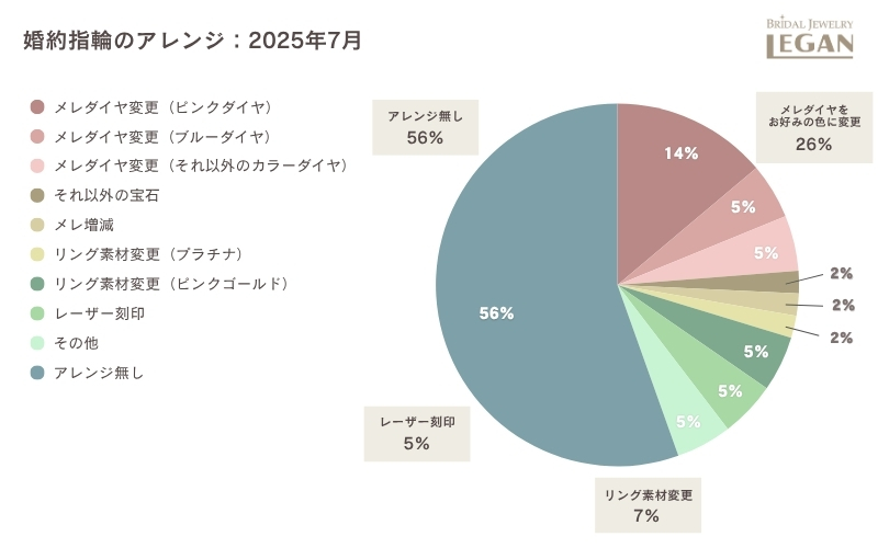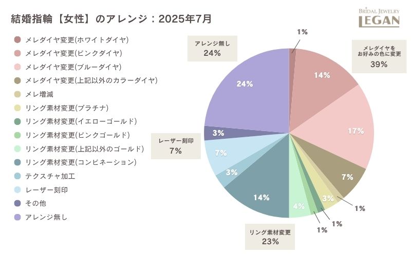 メレダイヤをお好みの色に変更する方が、26%いらっしゃいます。そのほか定番の名前や記念日などを入れるレーザー刻印や、リング素材を変更するアレンジが人気です。