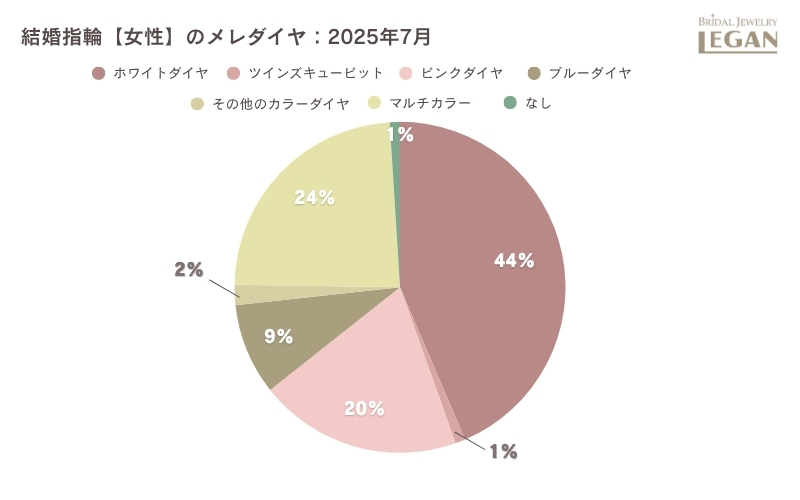 女性の結婚指輪は、ホワイトダイヤをメレダイヤに選ばれる方が44%。また、マルチカラーが24%、ピンクダイヤが20%と人気です。