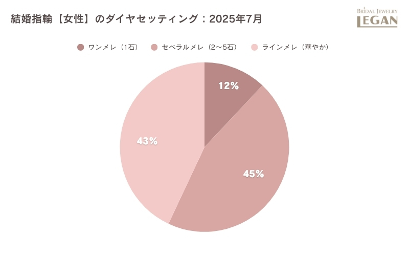 女性の結婚指輪のダイヤセッティングは、セベラルメレ(2~5石)が45%と一番人気。ラインメレを選択された方も43%いらっしゃいました。ワンメレ(1石)をご選択される方は12%と少数でした。