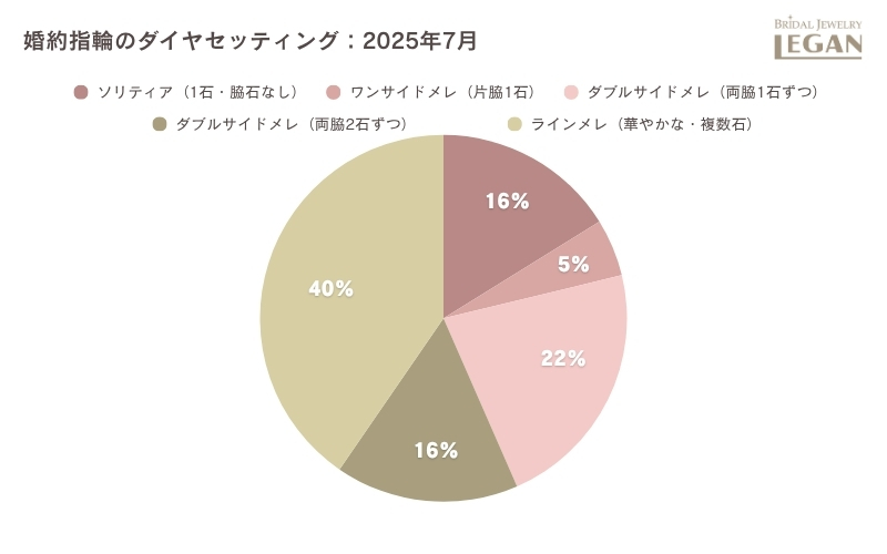 婚約指輪のダイヤセッティングは、華やかな複数ダイヤのラインメレが40%と一番人気。続いて、ダブルサイドメレ(両脇1石づつ)が22%、ソリティア(1石・脇石なし)が16%、ダブルサイドメレ(両脇2石ずつ)も16%でした。