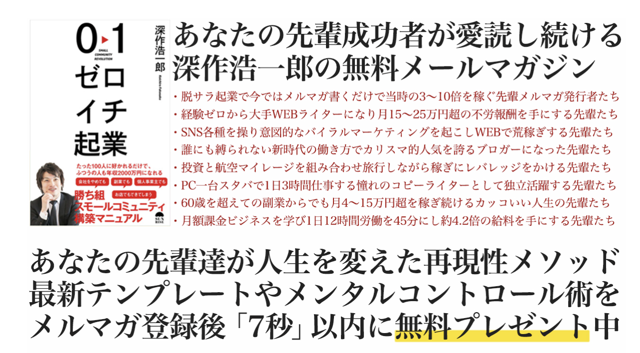 なお、キャンペーンの詳細・申込方法は、代表・深作浩一郎が配信するメールマガジン内でのみ案内されています。対象商品・特典の情報をご希望の方は、以下のメルマガ登録フォームよりご登録ください。