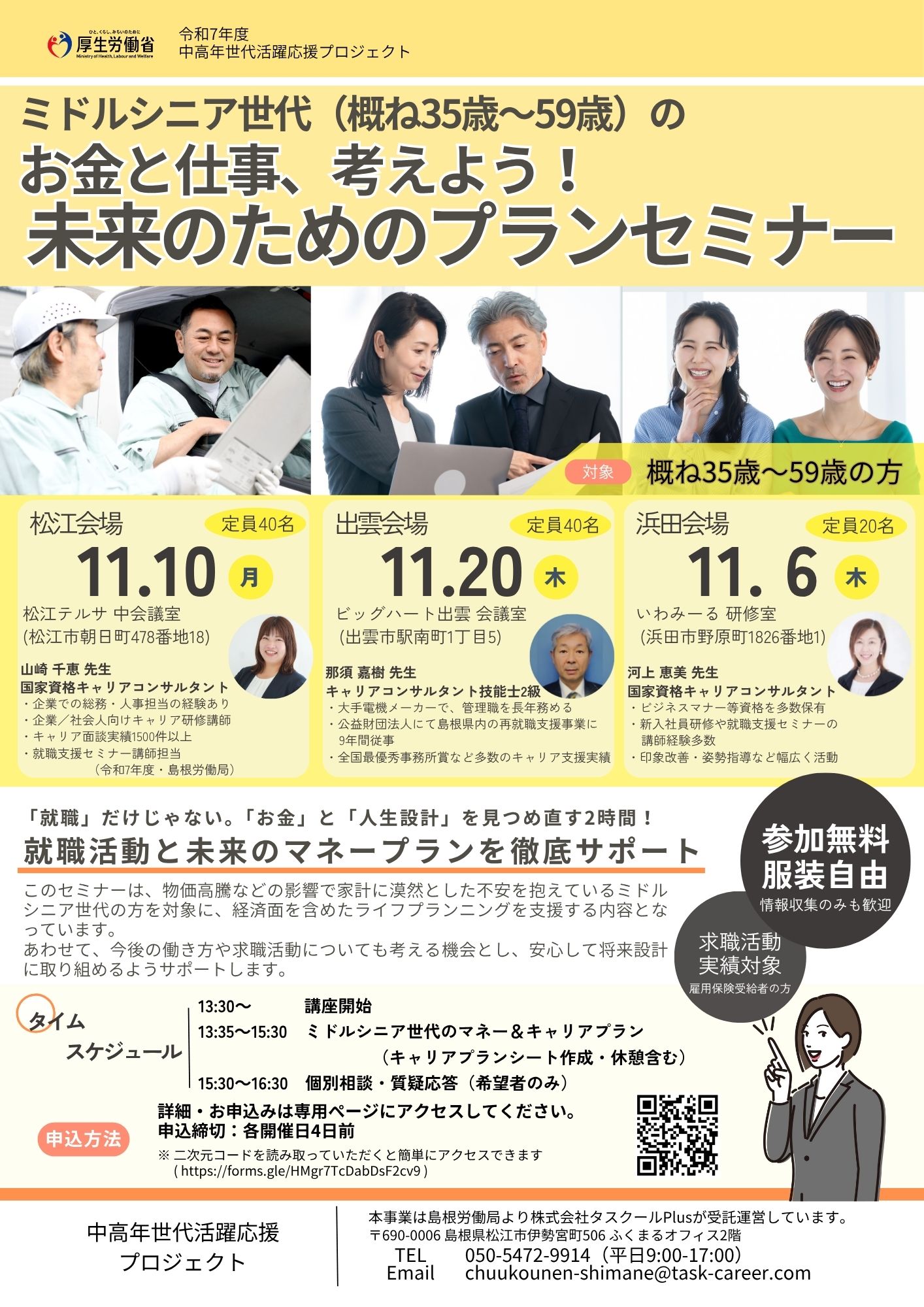 物価高騰や将来への漠然とした不安を抱えるミドルシニア世代(35~59歳)を対象とした「お金(マネー)とキャリアを考えるライフプランニングセミナー」が 本セミナーは、単なる就職活動のノウハウではなく、「マネープラン」と「キャリアプラン」を一体として捉える点が最大の特徴です。家計の不安の正体を明確にし、その不安を解消できる具体的な働き方(キャリア)を設計することで、受講者が自信を持って再就職活動に臨めるよう徹底サポートします。 講師陣には、企業人事経験者、キャリア支援で全国トップクラスの実績を持つ元所長、ビジネスマナー講師など、地元島根で活躍するキャリアコンサルタントが各会場に登壇。実践的なワークショップを通じて、参加者一人ひとりの「人生後半戦」の羅針盤を共に描きます。参加無料、服装自由で、情報収集のみの参加も歓迎します。