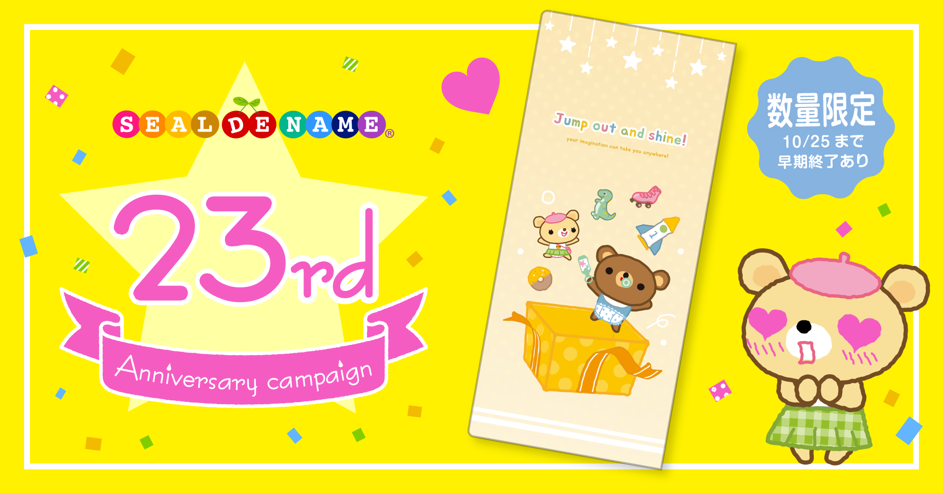 シールDEネームのコラム「いつDEもママらぶ」で登場するオリジナルキャラクターを入れた、23周年記念のために作られたオリジナルデザインです。少し幼い時期の姉弟のクマセとクマッタがプレゼントから飛び出してくるイラストと、裏面には23周年が印刷されています。お子さまから保護者さままでお使いいただけるデザインに仕上げました。