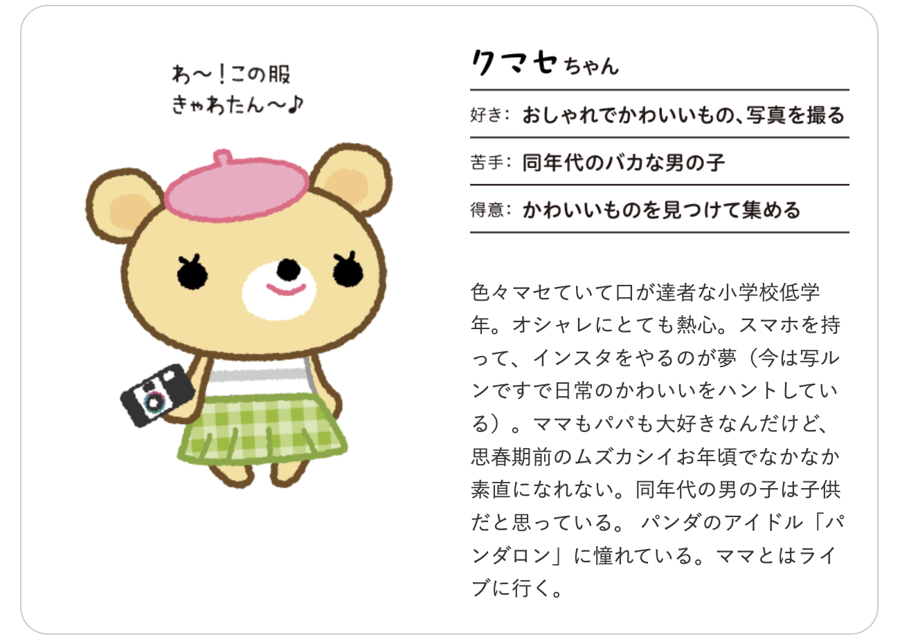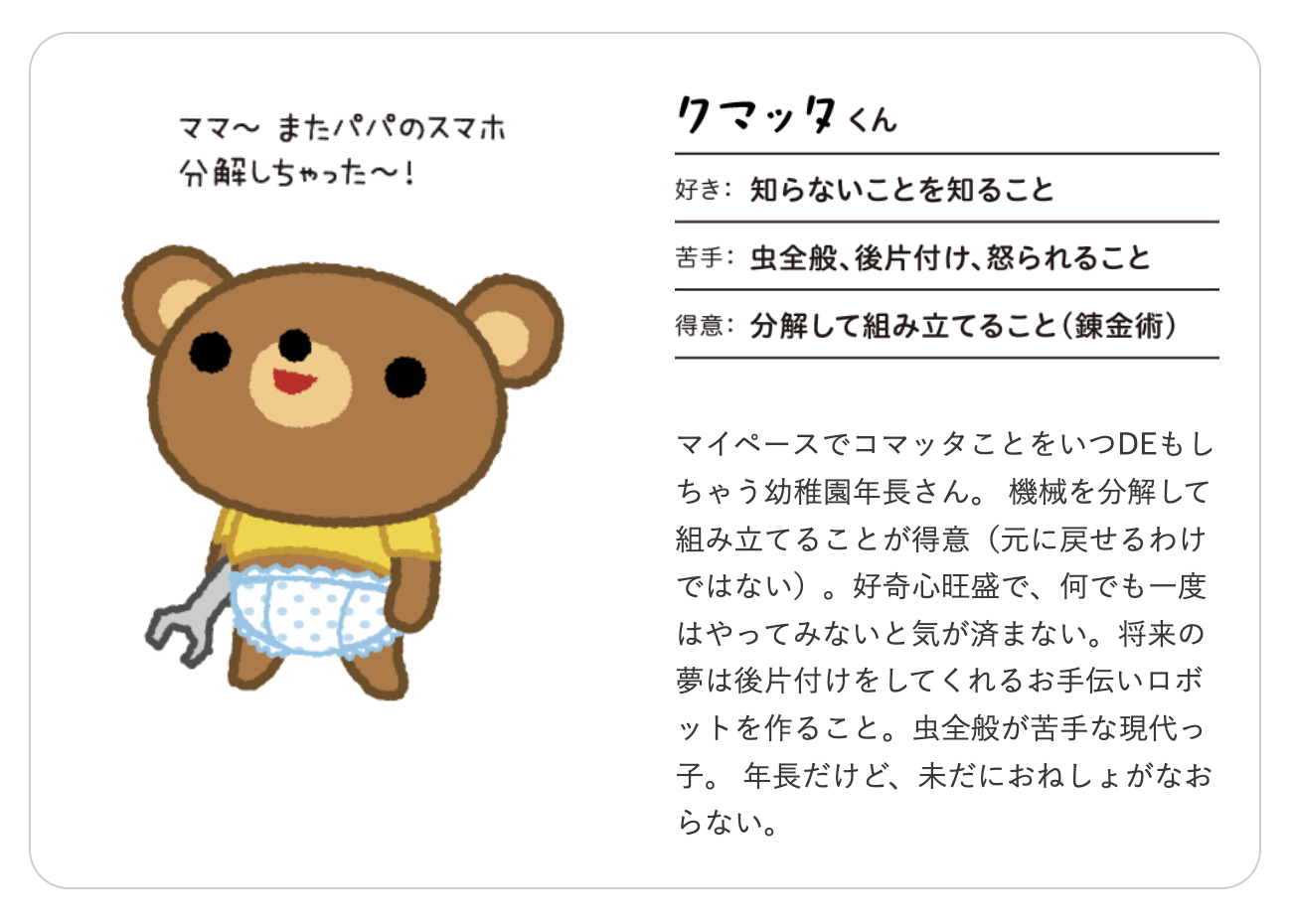 パパとママの子育てを応援するコラム&キュレーションサイトです。 家族の幸せな時間をたくさん作れるように、役立つ情報を発信しています。こちらのメインキャラクターのクマッタとクマセがノベルティのイラストに入りました。