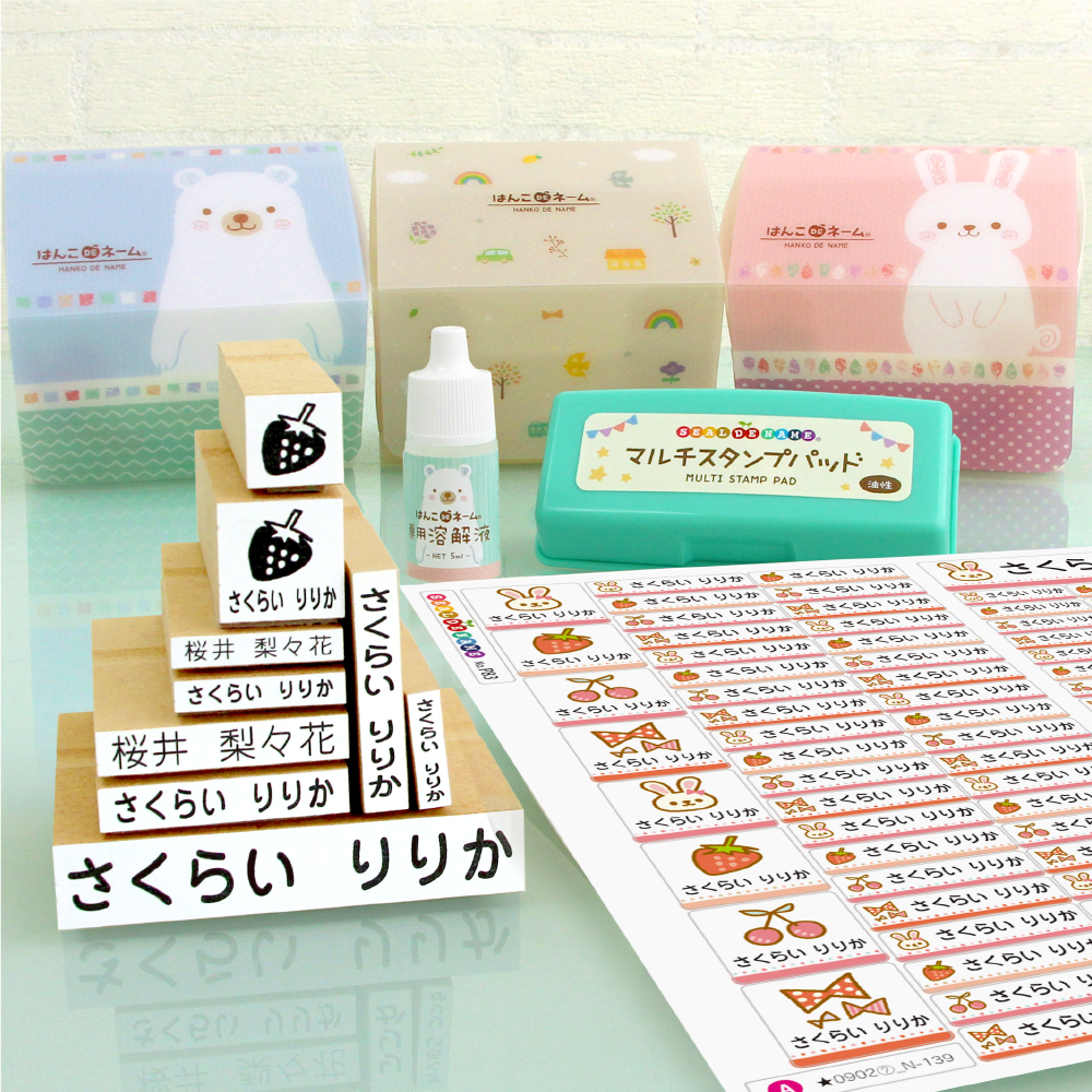 ■セット内容:防水お名前シール、お名前スタンプ8本、ぷちスタンプ1本、マルチスタンプパッド、インク溶解液、収納ケース