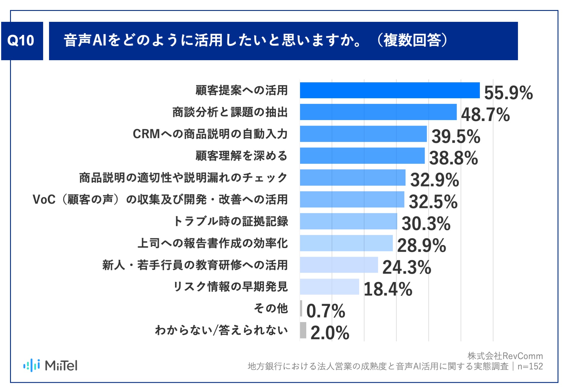 「音声AIをどのように活用したいと思いますか。」という質問に対し、「顧客提案への活用」が55.9%、「商談分析と課題の抽出」が48.7%、「CRMへの商品説明の自動入力」が39.5%という回答となりました。