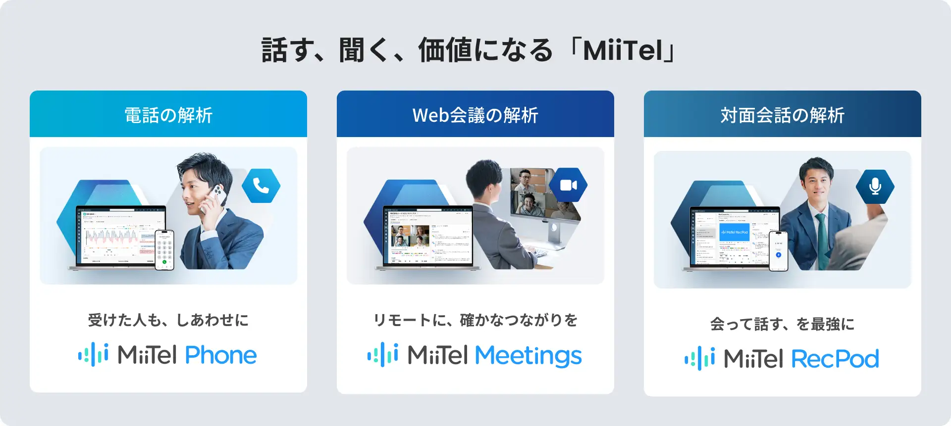 電話解析AI「MiiTel Phone」、コールセンター解析AI「MiiTel Call Center」、Web会議解析AI「MiiTel Meetings」、対面会話解析AI「MiiTel RecPod」の提供を通じ、コミュニケーションが発生するすべての場所における会話のビッグデータ化を実現します。