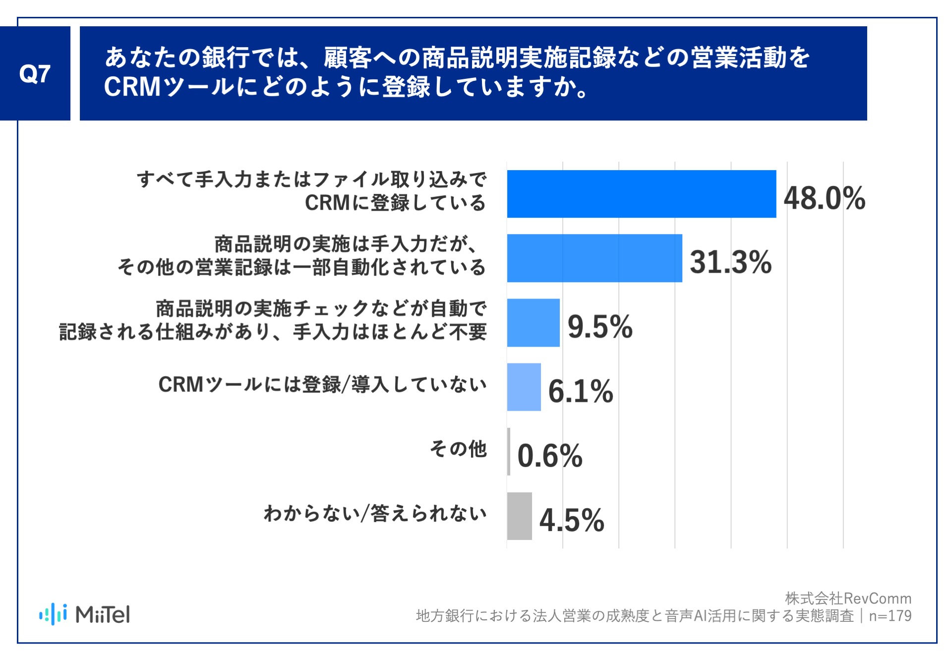 また、「あなたの銀行では、顧客への商品説明実施記録などの営業活動をCRMツールにどのように登録していますか。」については、「すべて手入力またはファイル取り込みでCRMに登録している」が48.0%、「商品説明の実施は手入力だが、その他の営業記録は一部自動化されている」が31.3%と、約8割(79.3%)が手入力中心の記録方法を示しました。