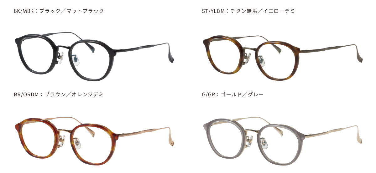 カラーは4色展開です。チタンは光沢ブラック、アセテートはマットブラック仕様にし、素材による質感のコントラストを味わうこだわりのブラックカラー「ブラック/マットブラック」。