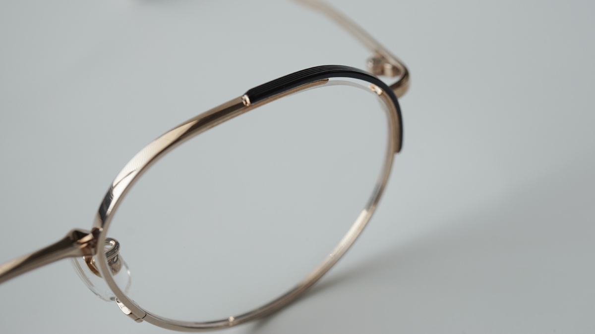 また、特徴的な外見とは裏腹に、顔にかけた時には、その強いコントラストはメッキの光沢に溶けてゆき、年齢や性別に関わらず、誰もがかけやすいフレームになっているのも魅力の1つです。メタルモダンを採用し、飾りリム以外のすべてのパーツを単色で仕上げることで、金属本来の質感に焦点を当てました。外形の美しさ、かけ心地、細部までこだわり抜いたMade in Japanの品質を誇るフレームです。