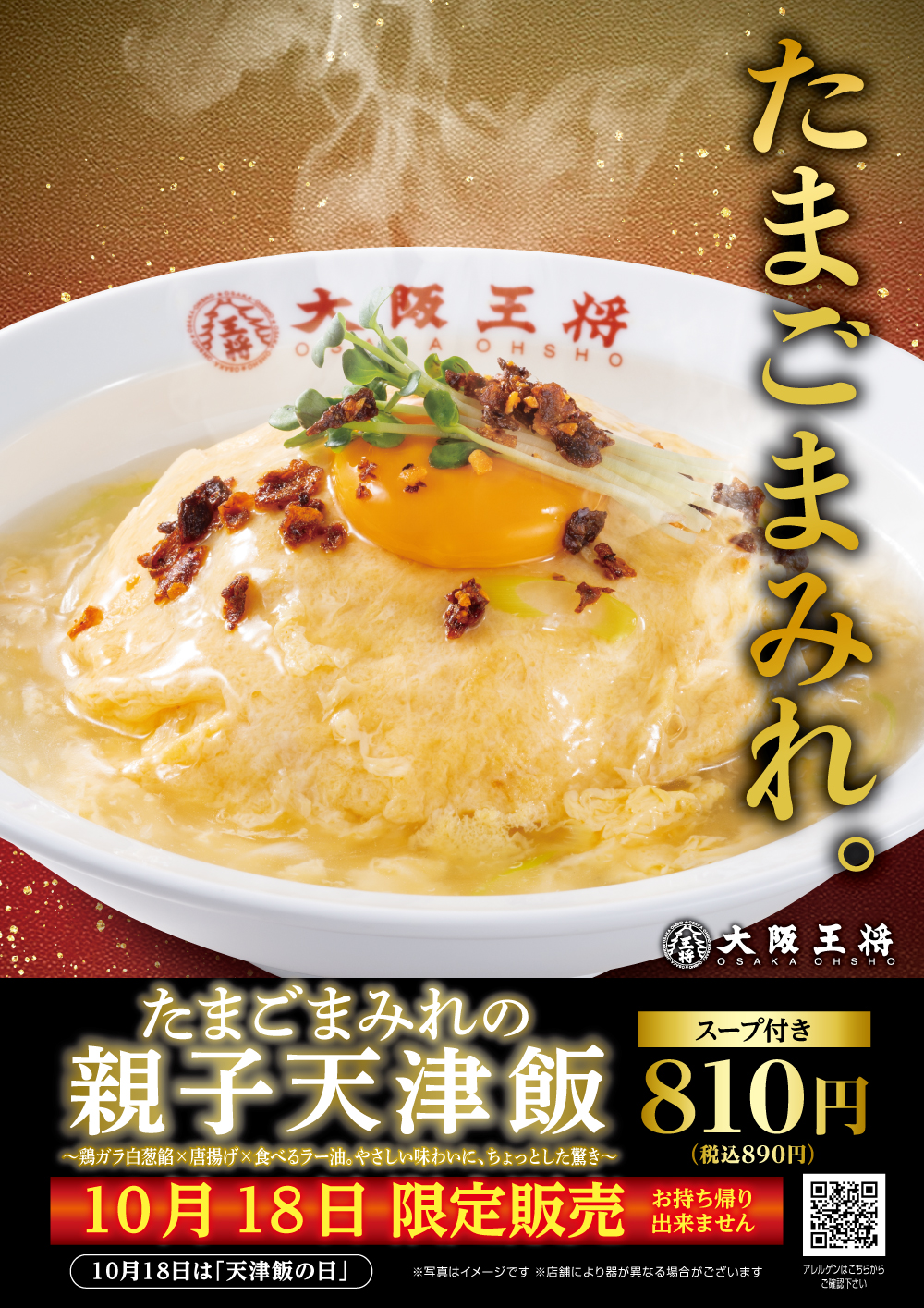 株式会社大阪王将(東京ヘッドオフィス:東京都品川区、代表取締役社長:文野幸司)は、10月18日の「天津飯の日」を記念して、2025年10月18日(土)に、特別なふわとろ天津飯『たまごまみれの親子天津飯』を1日限定で販売いたします。