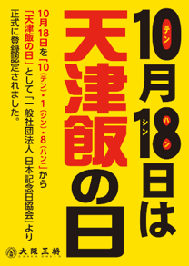 日本生まれの中華料理であり、街中華でも昔から愛され続け、地域や文化で餡の味や具材が異なる、奥深い天津飯。大阪王将の天津飯は、2.5cmもの厚みがある「ふわっふわ、とろっとろ」の玉子が特徴で、見た目の迫力とその柔らかな食感で、多くのお客様に愛され続けています。そこで、10月18日を「天津飯の日」(10(テン)・1(シン)・8(ハン)の日)として記念日登録申請を行い、「⼀般社団法⼈ ⽇本記念⽇協会」より正式に認定、業界全体で盛り上げています。