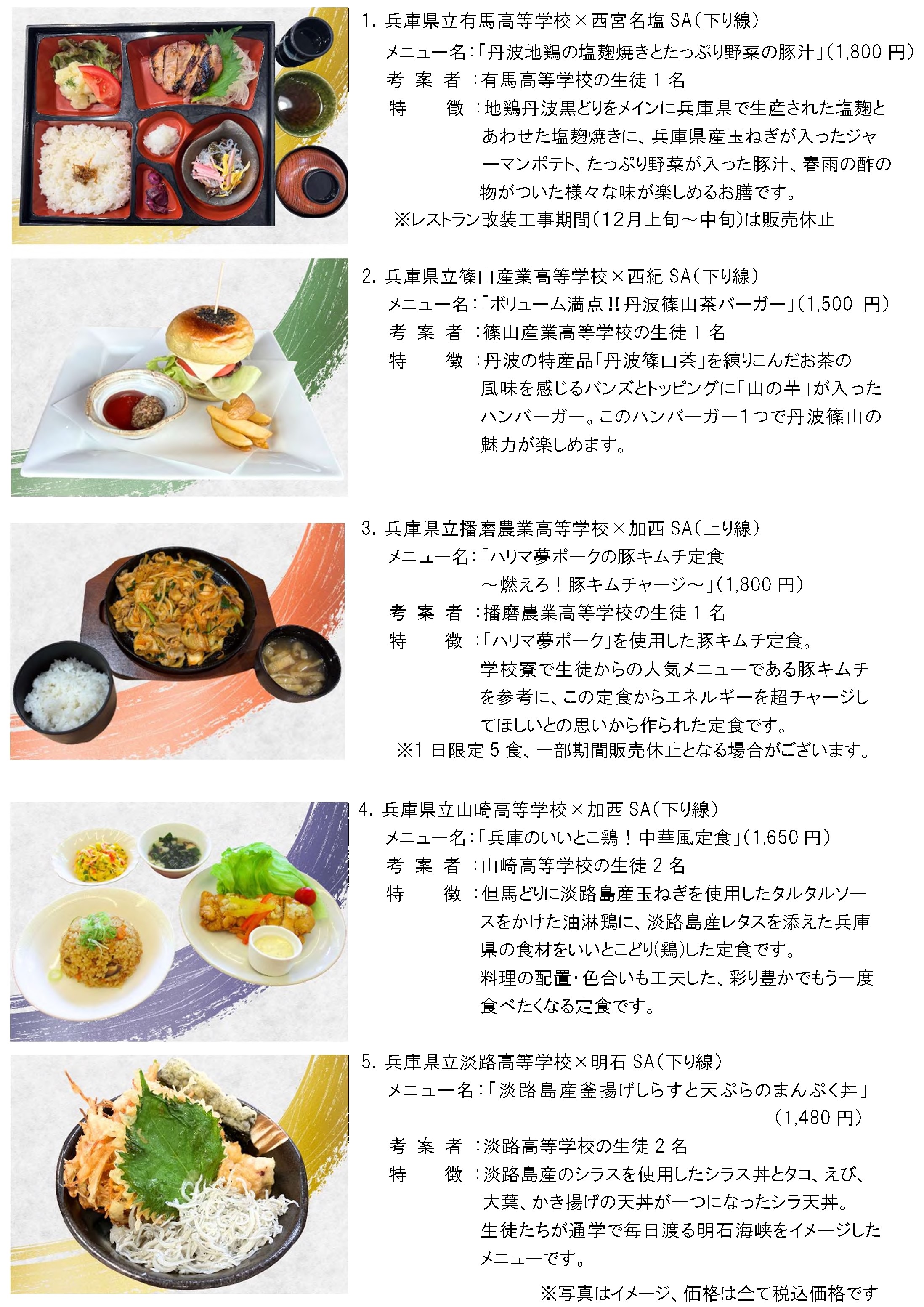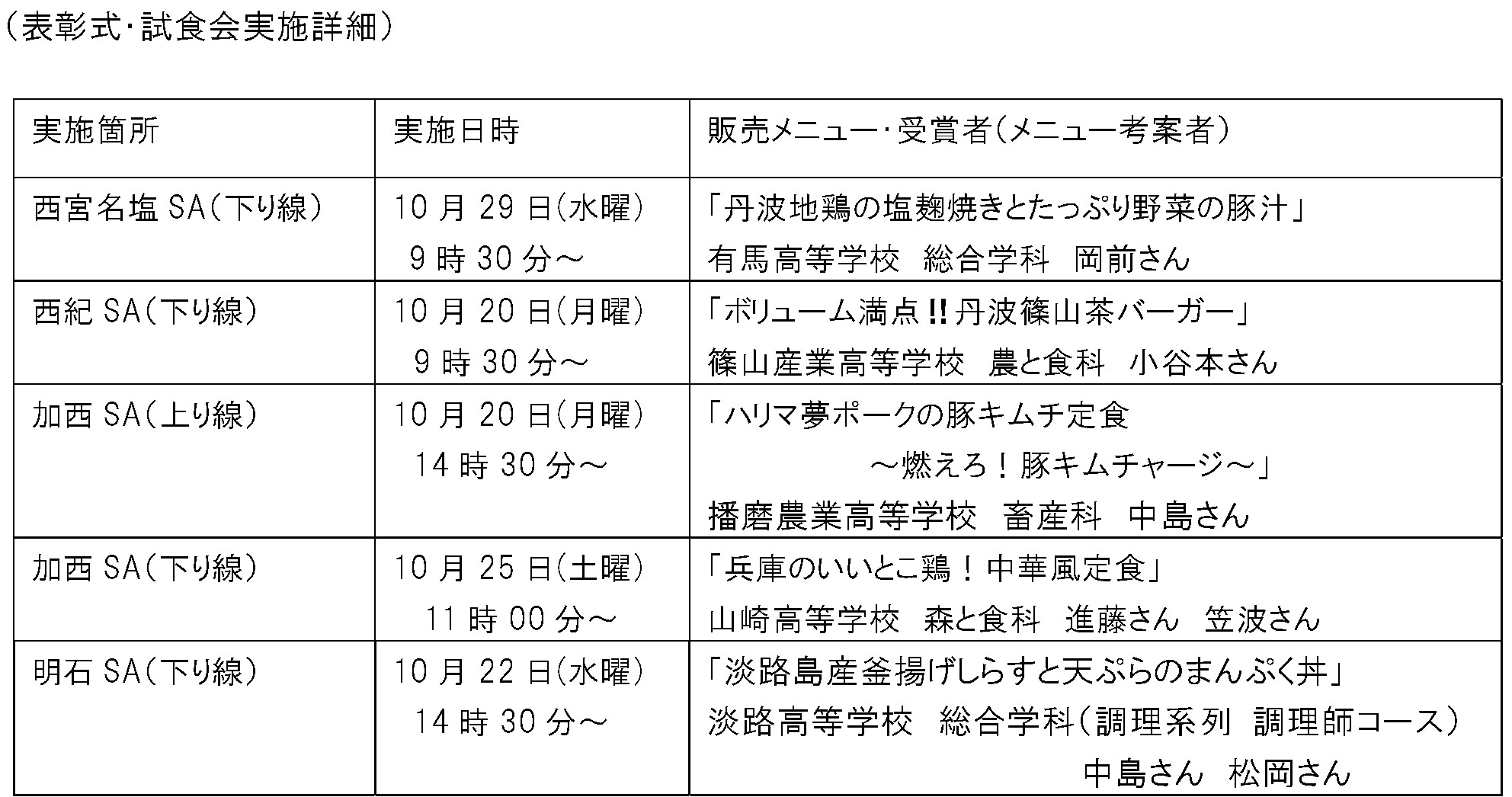 兵庫県立有馬高等学校(兵庫県三田市、校長:小川(おがわ) 秀雄(ひでお))、兵庫県立篠山産業高等学校(兵庫県丹波篠山市、校長:谷(たに) 昌亮(まさあき))、兵庫県立播磨農業高等学校(兵庫県加西市、校長:岩本(いわもと) 義裕(よしひろ))、兵庫県立山崎高等学校(兵庫県宍粟市、校長:塚本(つかもと) 師仁(のりひと))、兵庫県立淡路高等学校(兵庫県淡路市、校長:松本(まつもと) 宗弘(むねひろ))及び西日本高速道路サービス・ホールディングス株式会社関西支社(大阪府吹田市、支社長:佐田(さた) 惠(めぐみ))は、兵庫県の食の魅力の発信及び地産地消の促進を目的として各校の生徒が考案し、兵庫県内のサービスエリア(SA)5箇所で販売するメニューを決定しました。 11月より兵庫県内の各SAで順次販売いたしますので、ぜひお召し上がり下さい。 なお、販売に先立ち、表彰式・試食会を10月に各SAで開催いたしますので、報道関係者のみなさまはぜひお越しください。