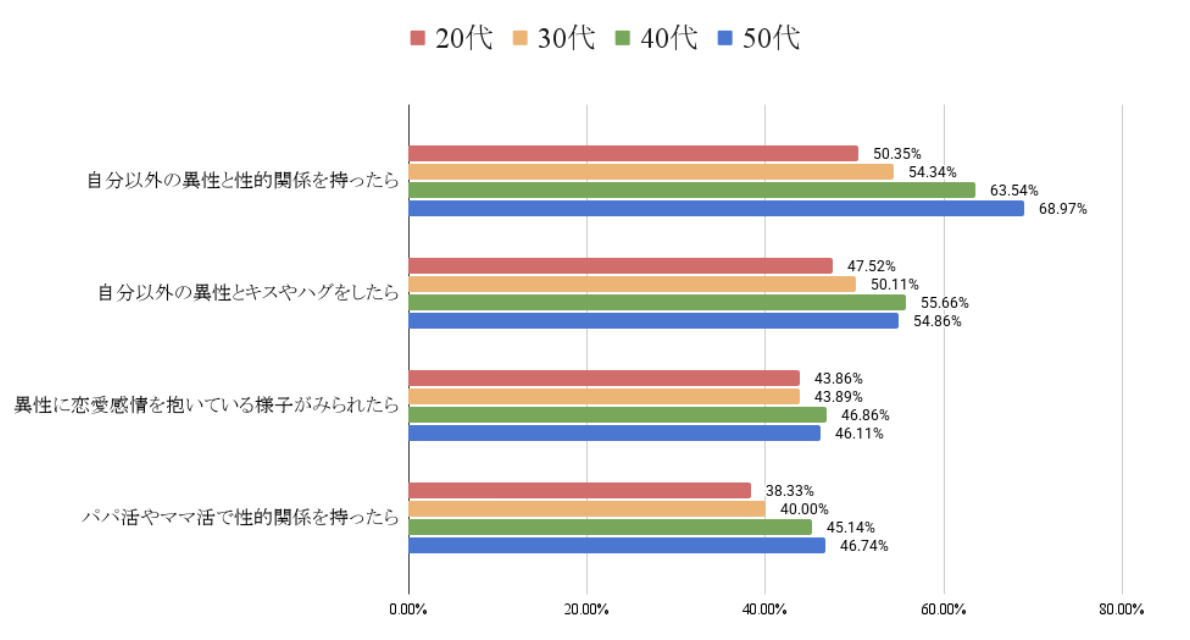3番目については「異性に恋愛感情を抱いている様子がみられたら」浮気と回答する人がどの年代も多い印象ですが、50代の人は「パパ活ママ活で性的関係を持ったら」浮気と回答する人が他の年代より多い結果となり、年齢が高くなるにつれ恋愛感情よりも性的関係を重視する傾向がうかがえます。
