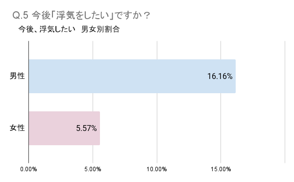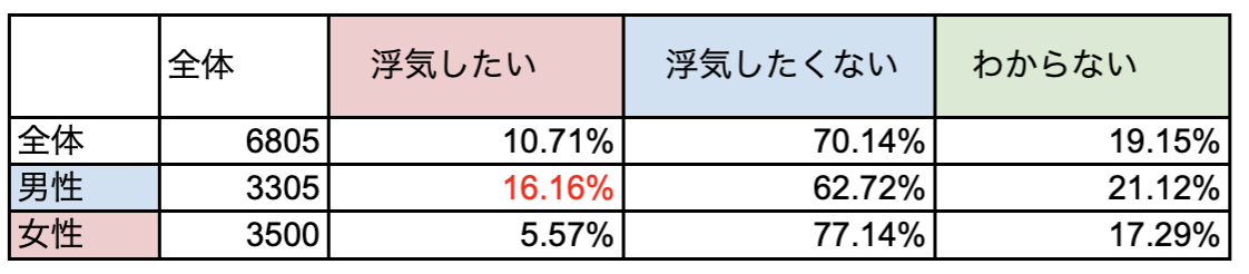 男女比較してみると、男性のほうが浮気したいと回答した人が3倍近く多い結果になった。